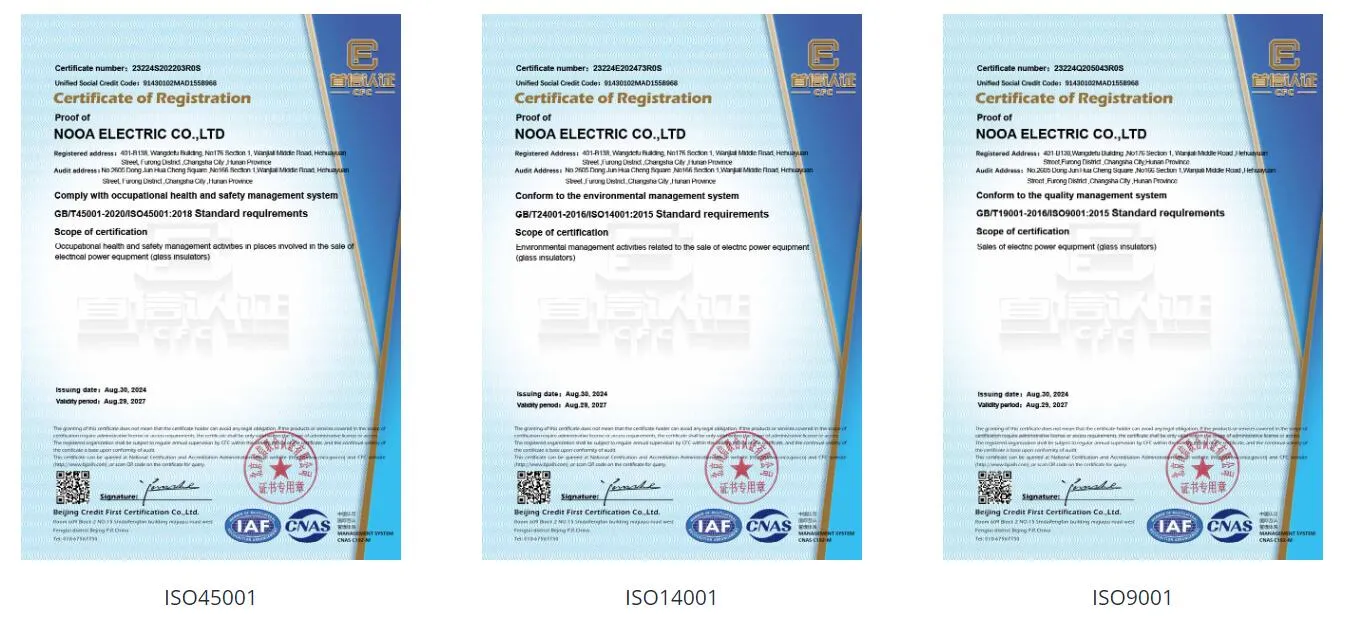 Nooa Electric Co., Ltd. - Chinese professional electrical insulators manufacturer with 21+ experience, covering an area of 70,000 square meters, and construction area is 50,000 square meters. There are more than 200 employees, including 25 technicians. The production capacity 3500000 pieces per year, and now setting up the new kiln and lines up to 10500000 pieces per year. We have been specialized in research and development of latest high-strength functional glass and power transmission insulators, which is the qualified supplier for State Grid Corporation of China and Southern State Grid Corporation of China, and is a participating unit of product standard formulation of the national electrical insulator standard committee.